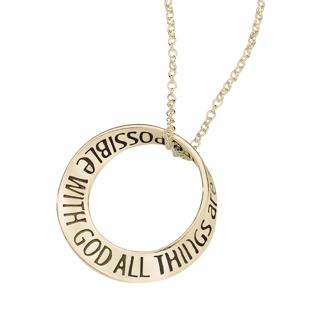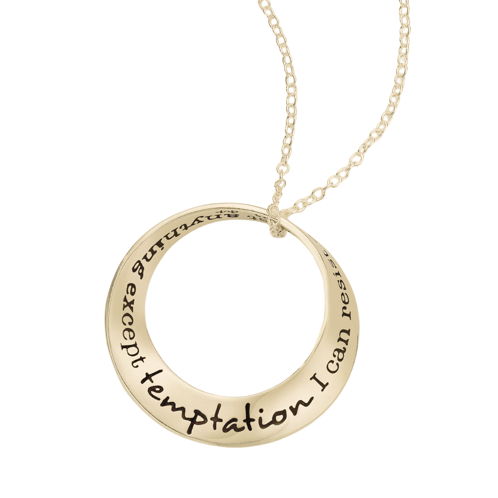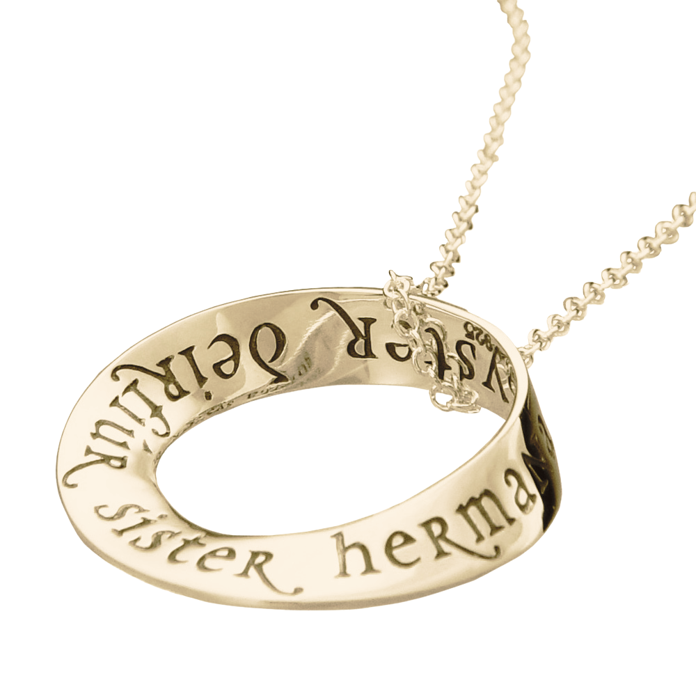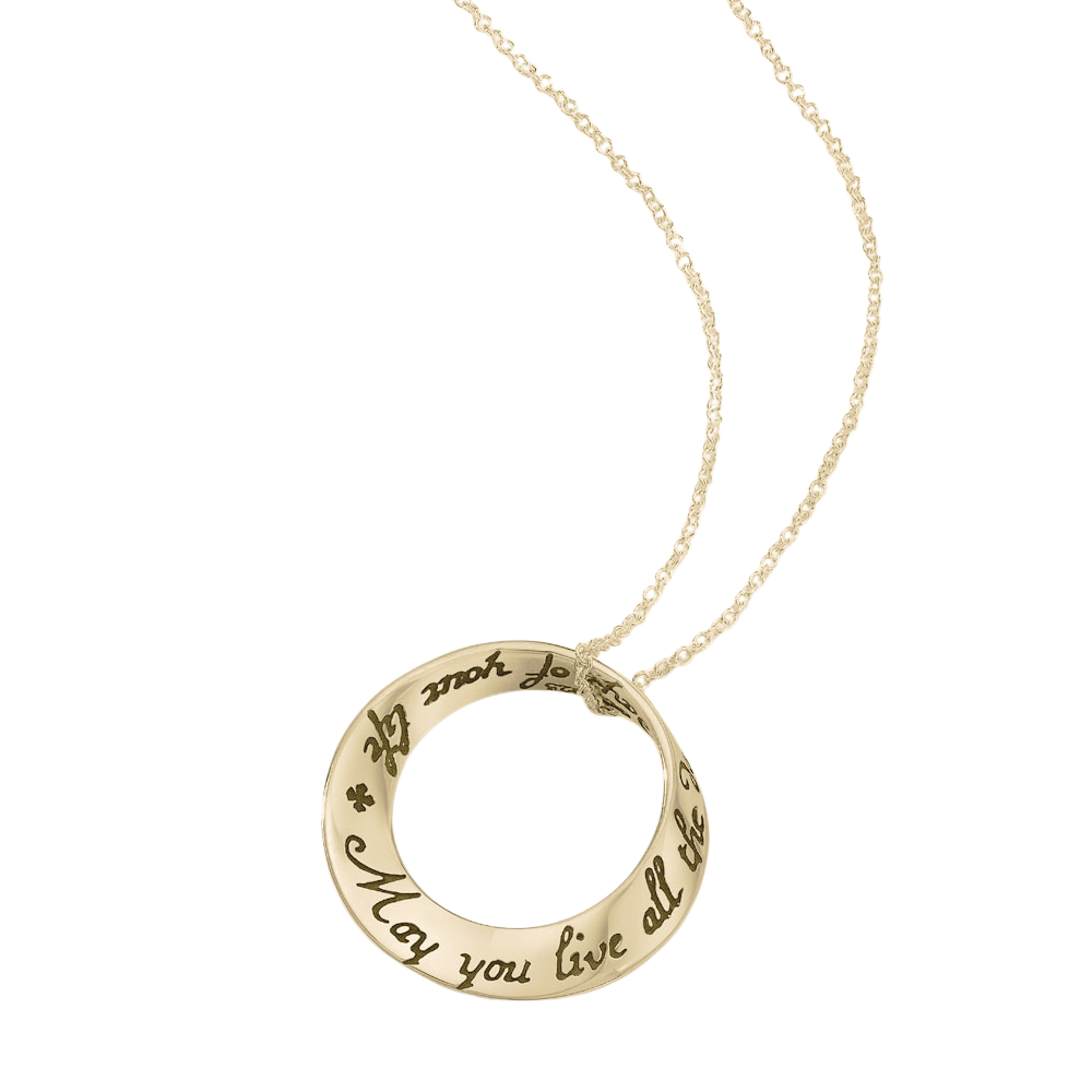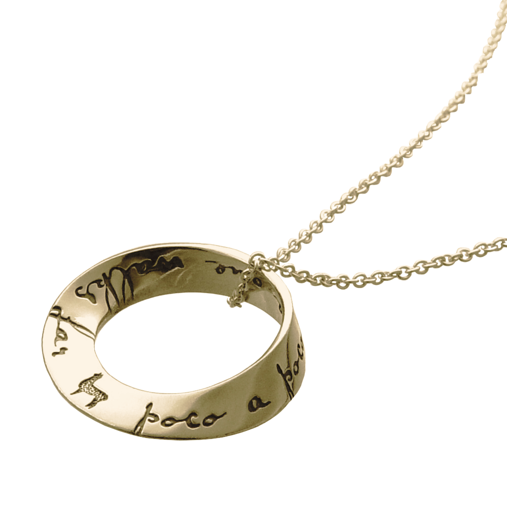 The mobius is our signature shape and we were one of the first jewelers to deduce how to reproduce it via the lost wax casting method. Named after the German mathematician August Ferdinand Möbius [1790-1868], the mobius represents the seeming paradox of a plane without end or one of infinite length. As such, it became accepted as a symbol for infinity. The oval mobius bracelets fit comfortably, turning easily on the wrist, so that the wearer can be reminded of the message at a glance. The single mobius necklace moves on the chain when worn, changing its appearance continually, while the message remains constant. Our new double mobius necklace with its flowing, complex shape is an exciting addition to the collection, allowing for a longer message than the single mobius. The engraved message on these pieces repeats around the plane into infinity.