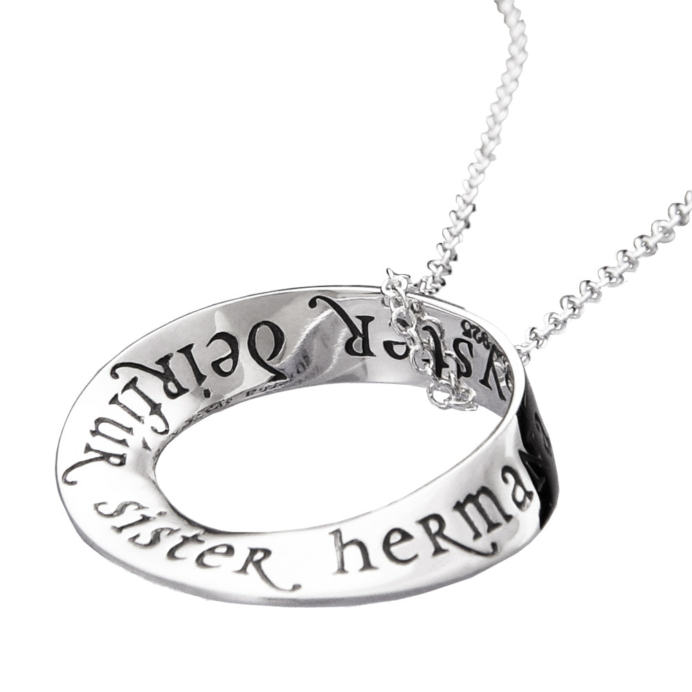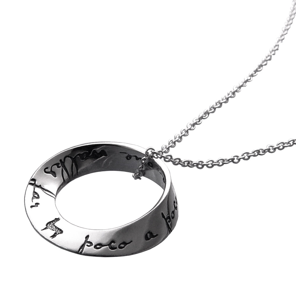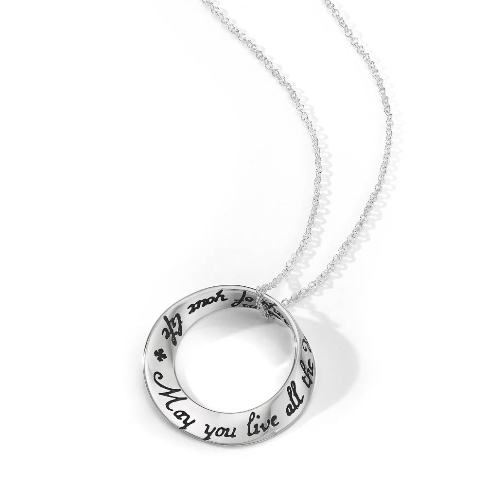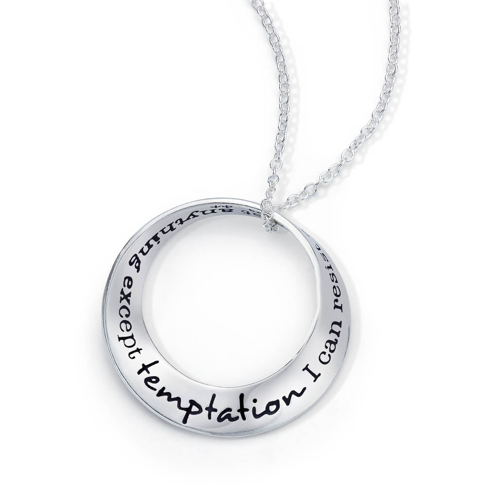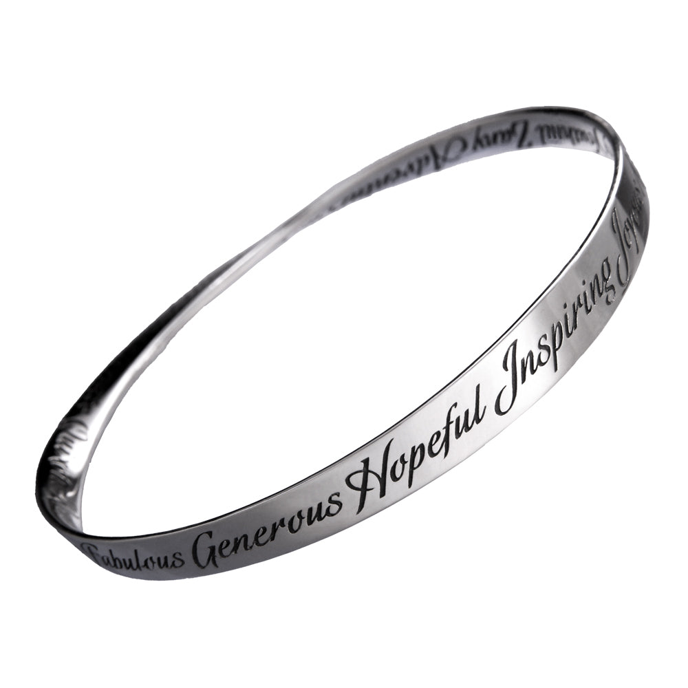 The mobius is our signature shape and we were one of the first jewelers to deduce how to reproduce it via the lost wax casting method. Named after the German mathematician August Ferdinand Möbius [1790-1868], the mobius represents the seeming paradox of a plane without end or one of infinite length. As such, it became accepted as a symbol for infinity. The oval mobius bracelets fit comfortably, turning easily on the wrist, so that the wearer can be reminded of the message at a glance. The single mobius necklace moves on the chain when worn, changing its appearance continually, while the message remains constant. Our new double mobius necklace with its flowing, complex shape is an exciting addition to the collection, allowing for a longer message than the single mobius. The engraved message on these pieces repeats around the plane into infinity.