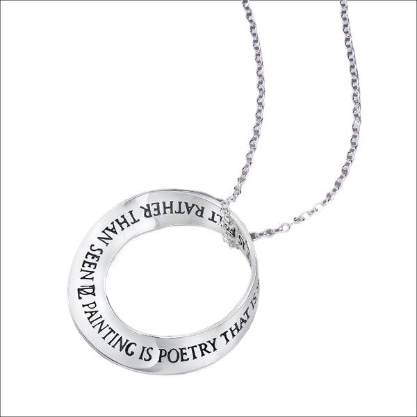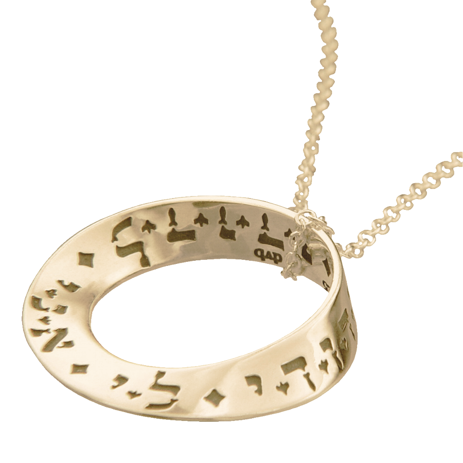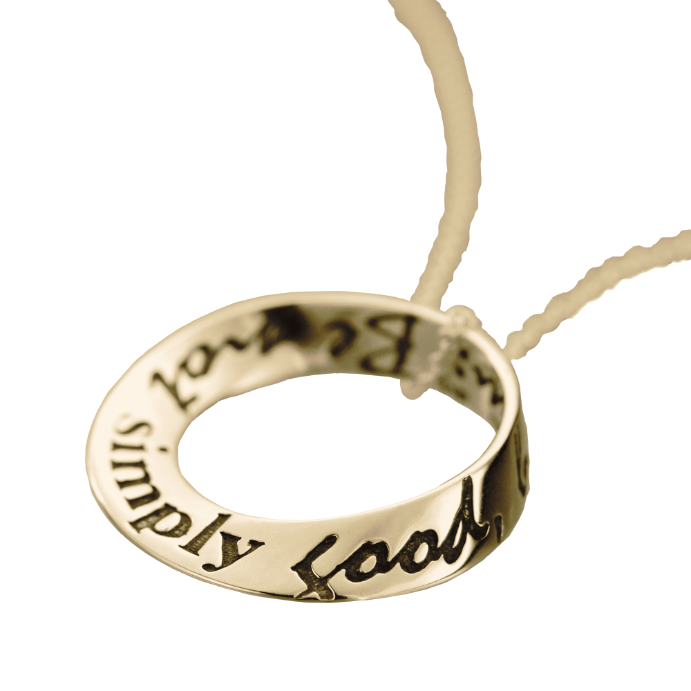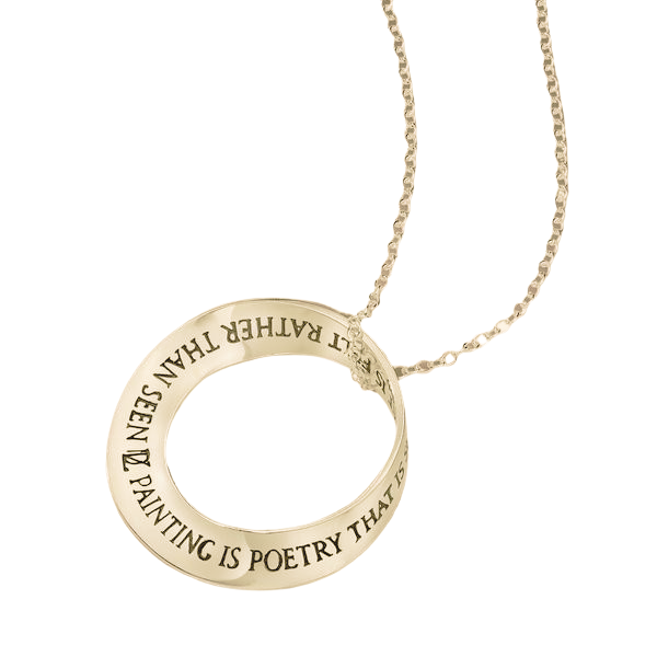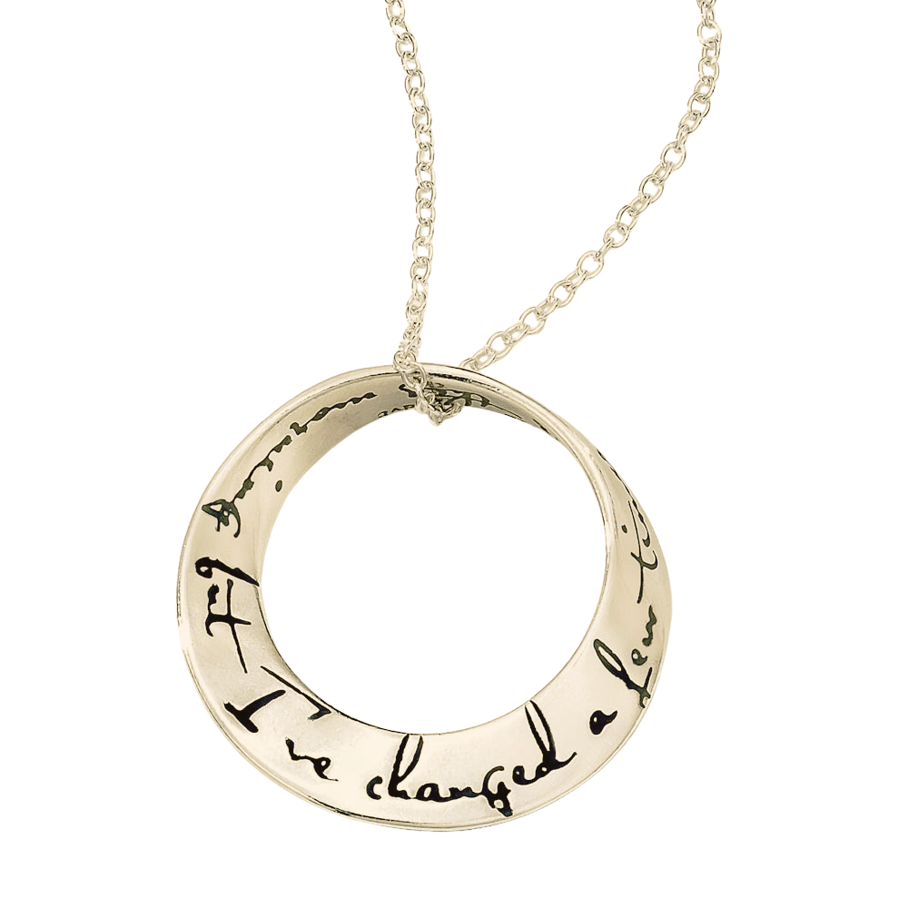 The mobius is our signature shape and we were one of the first jewelers to deduce how to reproduce it via the lost wax casting method. Named after the German mathematician August Ferdinand Möbius [1790-1868], the mobius represents the seeming paradox of a plane without end or one of infinite length. As such, it became accepted as a symbol for infinity. The oval mobius bracelets fit comfortably, turning easily on the wrist, so that the wearer can be reminded of the message at a glance. The single mobius necklace moves on the chain when worn, changing its appearance continually, while the message remains constant. Our new double mobius necklace with its flowing, complex shape is an exciting addition to the collection, allowing for a longer message than the single mobius. The engraved message on these pieces repeats around the plane into infinity.